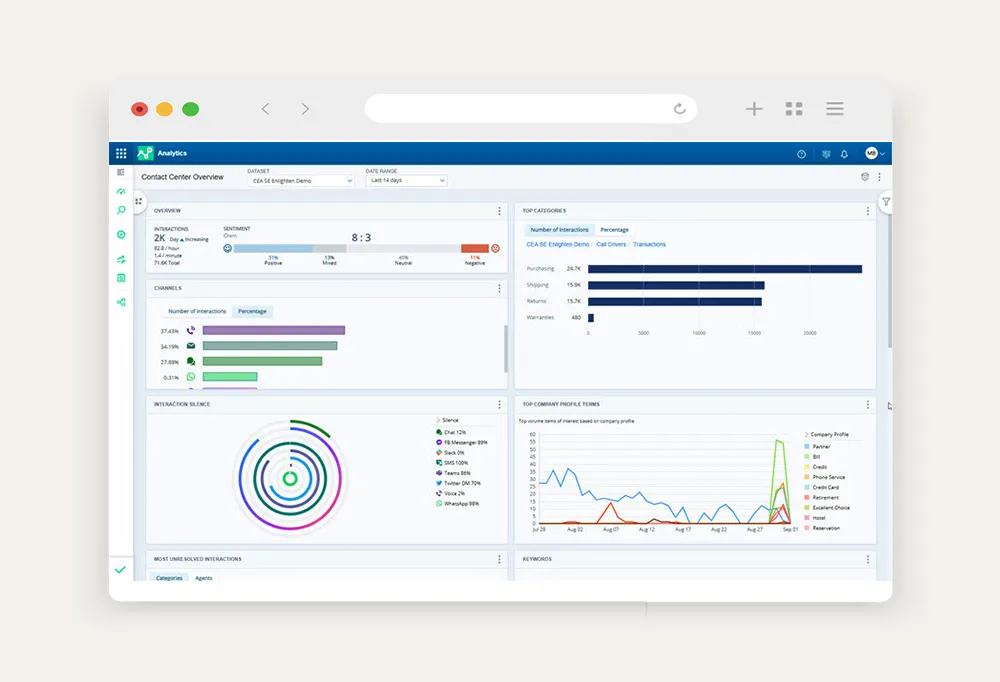Aprovecha el Análisis de Interacciones impulsado por IA para identificar tendencias, sentimientos y causas raíz, de modo que puedas tomar decisiones más inteligentes y convertir los datos en un impacto real para el negocio.Ver la demostración Solicitar una cotización